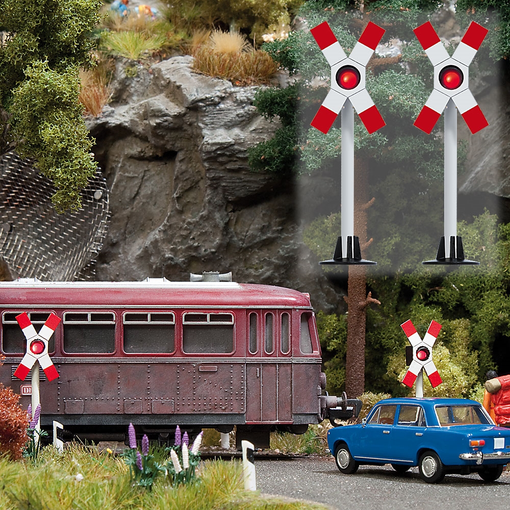 2 типичные переездные мигалки, используемые в ГДР, используются и сегодня. Электронное реле и светодиоды обеспечивают бесперебойную работу. В сочетании с ИК-световым барьером и таймером (№ 5961) мигалки могут включаться автоматически путем приближения тяги.