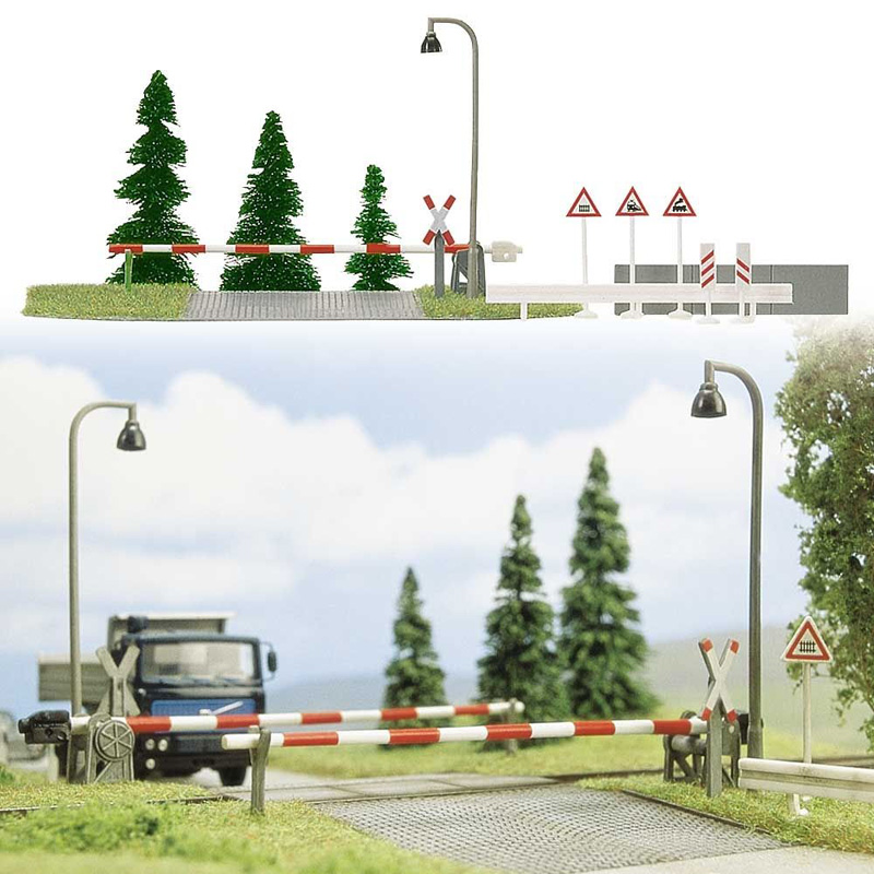 Фундаментная плита с проезжей частью булыжной мостовой, 2 барьерами (без функции), 2 мигалки, 2 лампам (без функции), главные барьеры, ограничительные столбы, маршрутные щитки, 3 елки.