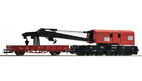 Ремонтный состав: Кран Kranwagen DB AG и платформа Rr20 DB EpV\VI (148 и 124 мм.) Модель крана снабжена функциями (осуществляются в ручную): поворот крана на 360°, подъём стрелы и грузового крюка. В комплект входят съёмные функциональные ручки для управления стрелой и крюком, а так же опорная стойка для фиксации стрелы при транспортировке крана (устанавливается на платформе).